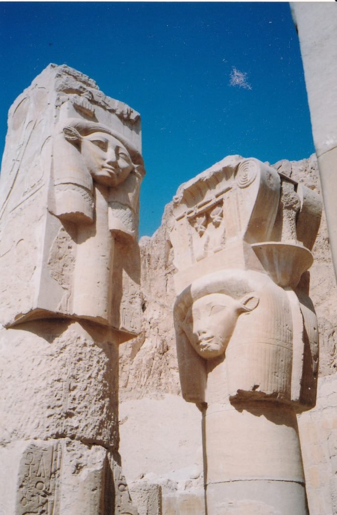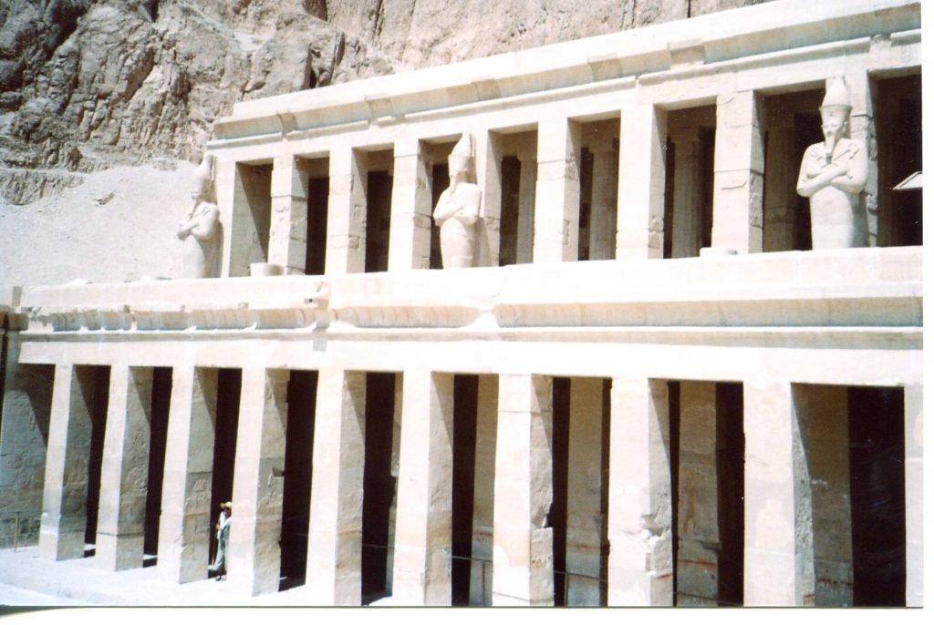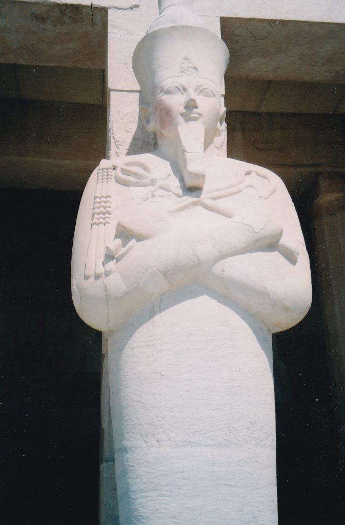 The third row of columns front the temple’s upper terrace. A statue of Hatshepsut in the form of Osiris fronted each pillar (below). To me, her beautiful face made this formulaic representation come to life.