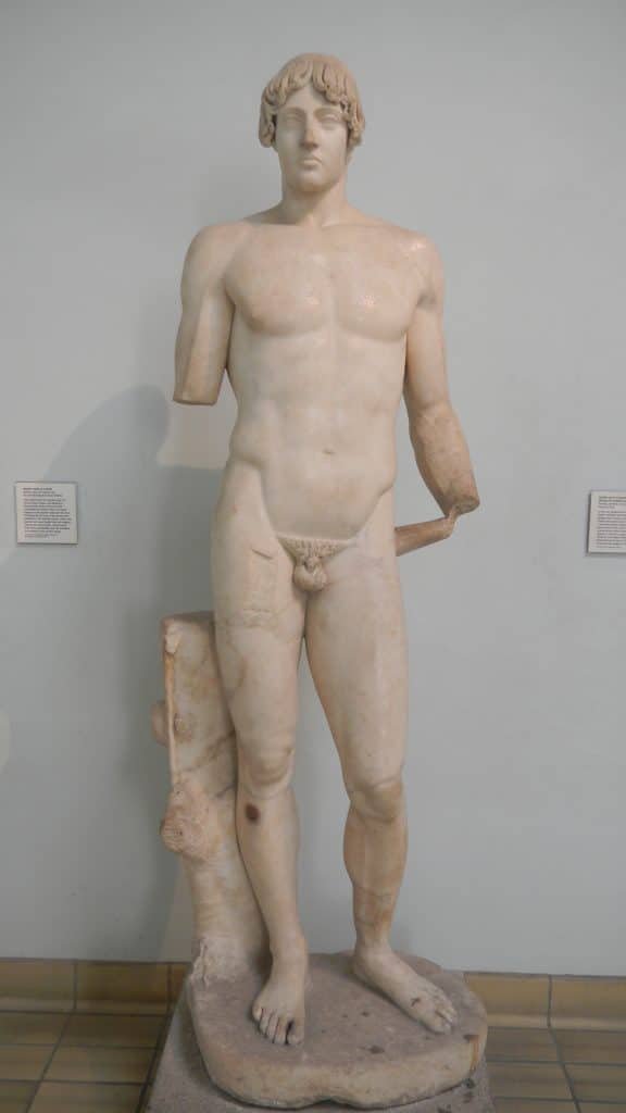 Kenneth Clark, in The Nude; A Study in Ideal Form, wrote that the games gave the Greeks’ cult of physical perfection religious dignity. The male body’s strength and proportionate form reinforced their model of reality. Statues first faced the front and looked straight ahead, and their limbs hung in symmetry with each other. Clark likened early Greeks’ statues to their temples, with two column-like legs supporting a flat torso which is crowned by a broad chest.