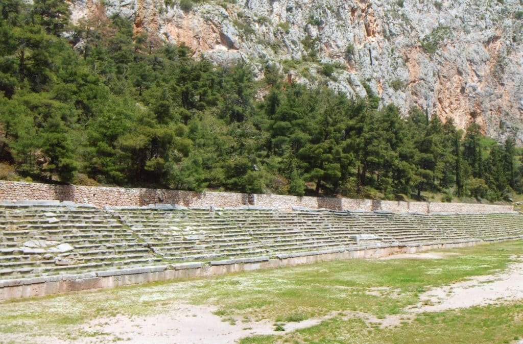 Olympia’s local aristocrats had consulted its oracle of Zeus and organized athletic contests since at least the eighth century BCE, and competitors soon came from more distant lands. By the early sixth century BCE, three new international sporting festivals were established. The Pythian Games began at Delphi (pictured below), the Nemean Games started in an area between Corinth and Argos, and the Isthmian Games were established near Corinth.