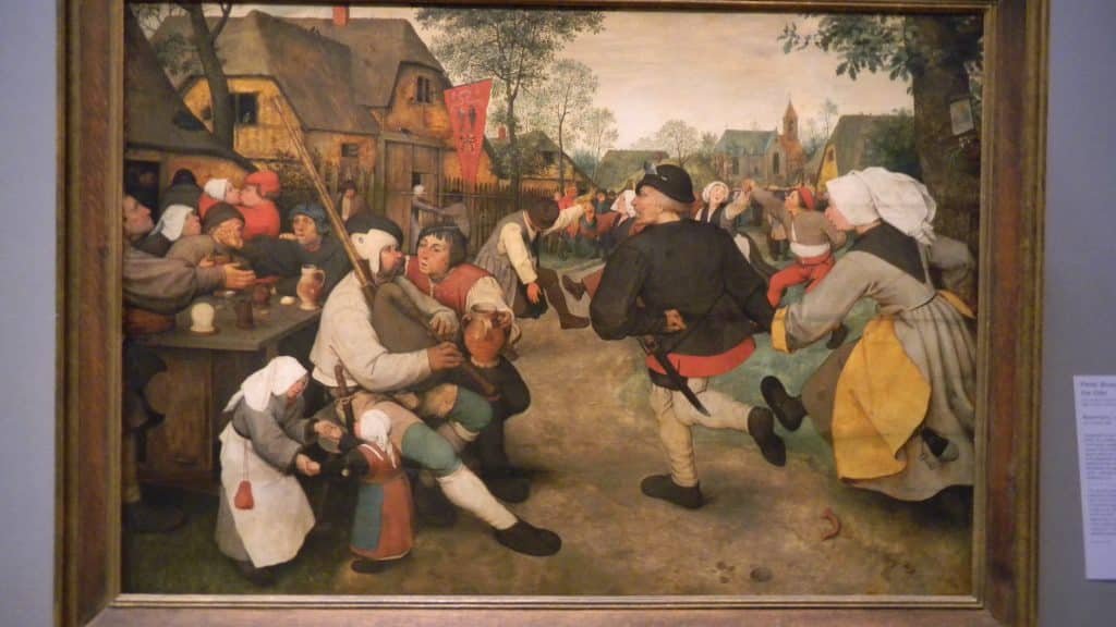 Some Italians who visited Flanders in the 16th century wrote that its people lacked style. They worked and drank so hard that their lives alternated between stony sobriety and blind drunkenness (Bruegel shows peasants drinking it up on a Sunday as two wealthy visitors appear scandalized).