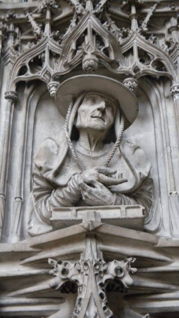 Christ as a feeling human being, rather than the universal king, was increasingly worshipped, and artists vividly showed his agony (the above sculpture is in Prague and the crucifix below is in Cologne’s cathedral).