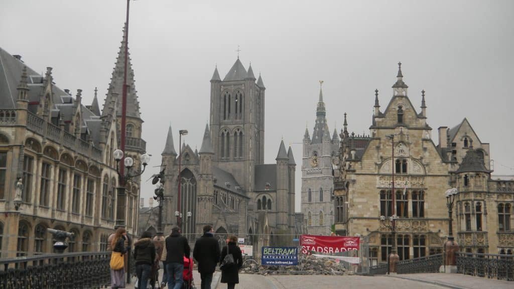 When I explored medieval towns in Belgium, grey clouds usually covered the sky. Since I always wanted to be sober in order to explore as much as possible, I looked into every one of the many chocolate shops in sight and always carried several pieces with me. I craved something to make me feel warm in the gloomy climate, even around Ghent’s magical late-medieval towers (below).