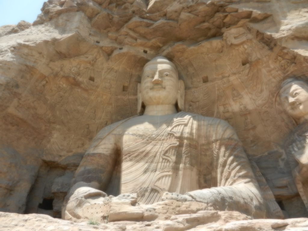 The earliest Yungang caves followed a militaristic aesthetic, with enormous Buddhas in simplified shapes that can make a person fear that he’ll be crushed if he sneezes in front of them. The historian Mark Edward Lewis, in China between Empires, wrote that the first five caves built at Yungang might have portrayed Wei emperors as Buddhas. Monks in the southern dynasties gained the privilege of not having to bow to the emperor, but the Wei Dynasty’s chief monk declared that all monks should bow to the king, asserting that the ruler is an incarnation of the Buddha. He worked in the government department that oversaw Buddhist practices, appointing officers for the realm’s major religious establishments. Some Chinese scholars have called the initial five caves (16, 17, 18, 19, and 20) the Five Imperial Caves (the Buddha in Cave 18 is shown below).