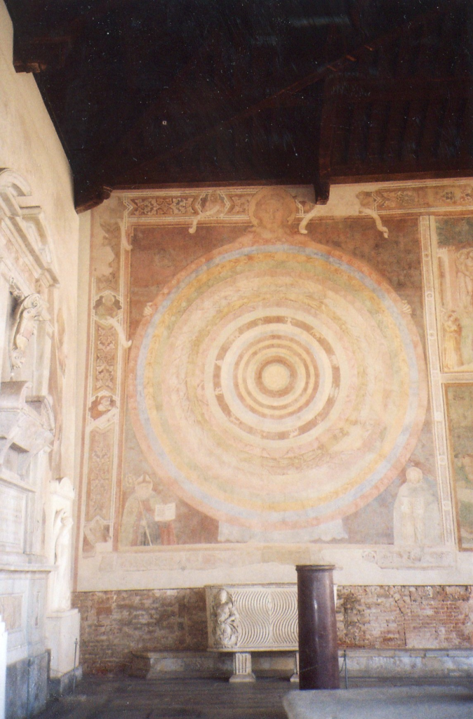 The Campo Santo was built next to Pisa’s cathedral, so it’s part of the Field of Miracles. Campo Santo means Holy Field. Pisans shipped soil from Mt. Golgatha in Jerusalem and made this area their burial ground. Alick McLean, in The Art of the Italian Renaissance, wrote that Pisans might have done this because they had conflicts with the Papacy. Pisans often supported the Holy Roman Emperor in his dog fights with the Church, and they sometimes didn’t join the crusades. This commercial city was aware of its growing stature in Europe, and it was pursuing its own course. The folks of Pisa might have created a transplanted Jerusalem to ensure their well-being in the afterlife.