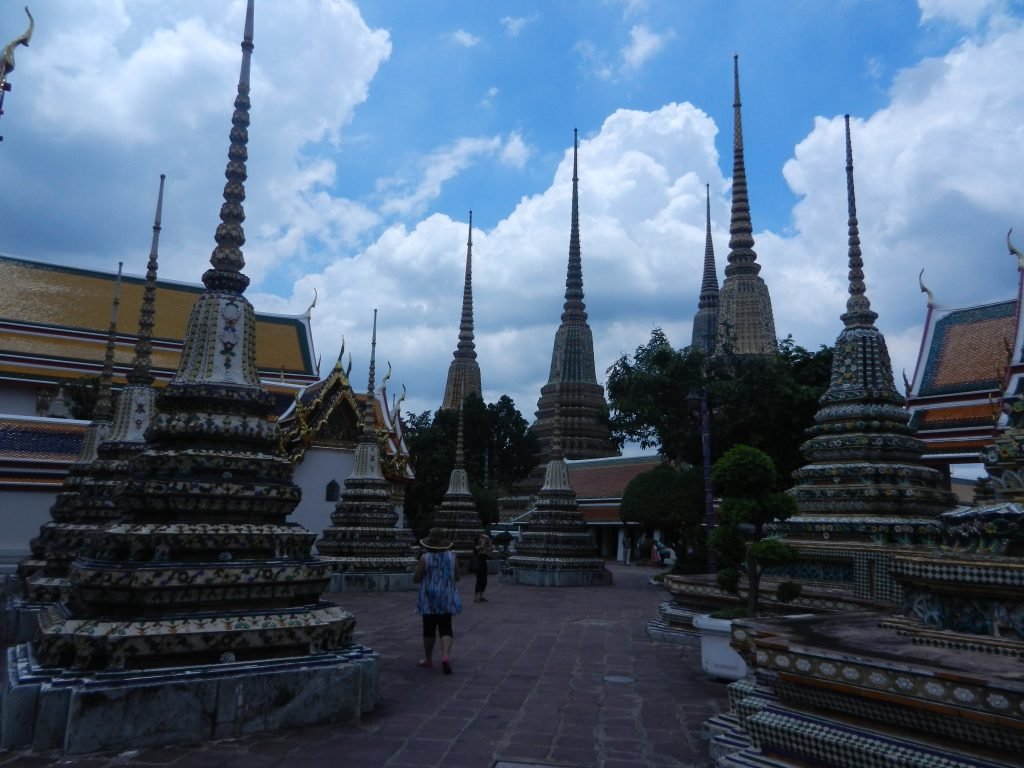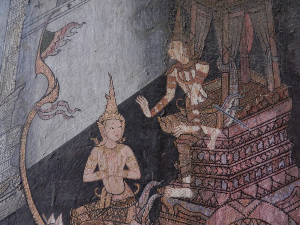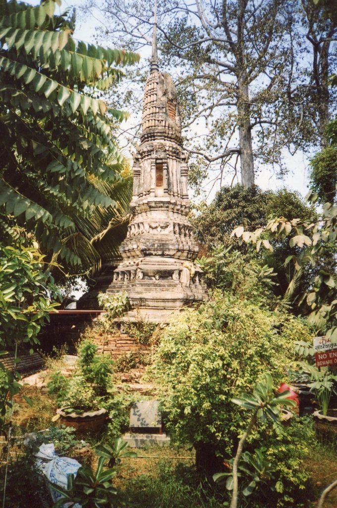 An excellent way to explore Thai wats is to slowly approach them and amble through their courtyards and viharas. This is how Thais have traditionally visited them. There’s no vantage point from which people can see the whole. This is so in Jayavarman VII’s big foundations in Angkor as well, but they often straitjacket the gaze into long, narrow corridors and small courtyards. Perspectives are usually freer in Thai architecture. They meander through dancing forms and flickering colors. Boat-like halls, curving roofs, and rippling stupas don’t sharply contrast with surrounding spaces. Surfaces and spaces mingle into a happy flow that people can wander through and see from many angles.