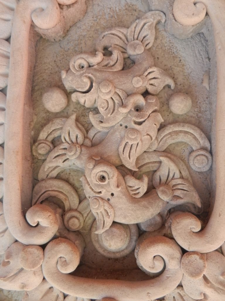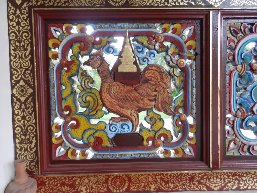 Like a lot of Thai art, the wat has many folksy touches. Zodiacal animals like the rooster (above), proudly strut under the balustrades in front of the assembly hall. Like the figures in the first photos, they blend with floral patterns that are both flame-shaped and graceful.